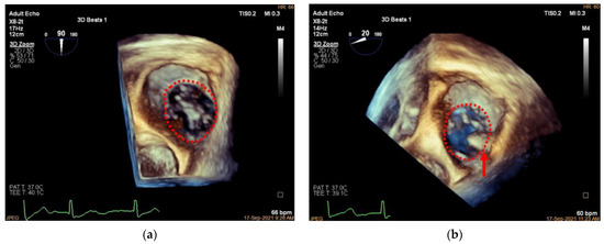 Three-dimensional comparison of TA morphology before and after K-Clip™ implantation. (a): Three-dimensional TEE work plane showing the TA morphology before annuloplasty; (b): the same view showing the TA (red dotted line) and clip position (red arrow) after intervention.