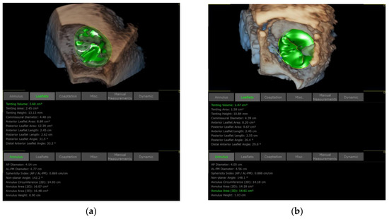 Comparison of TA and TV dimensions before and after K-Clip™ implantation. (a): TA and TV measurements before annuloplasty; (b): TA and TV measurements after intervention.
