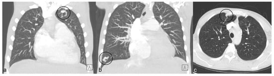 Contrast-enhanced chest CT. Coronal MIP (a,b) and axial (c) images show peripheral AVMs, seen as non-calcified nodules with a feeding arterial vessel (within black circle in b). MIP: Maximum Intensity Projection.