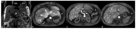 Abdominal MR. Coronal SSh image (a) and axial images on the arterial phase (b–d). Hepatomegaly and free abdominal fluid are seen (Black asterisk on (a) and white asterisk on (b–d). The hepatic veins as well as the inferior vena cava are dilated and show early enhancement (white arrows) due to extensive arteriovenous shunts and heterogeneous enhancement (within white circles). Due to these shunts the hepatic artery is dilated (white arrowheads) and multiple arteries are seen on the liver hilum. SSh: Single Shot.