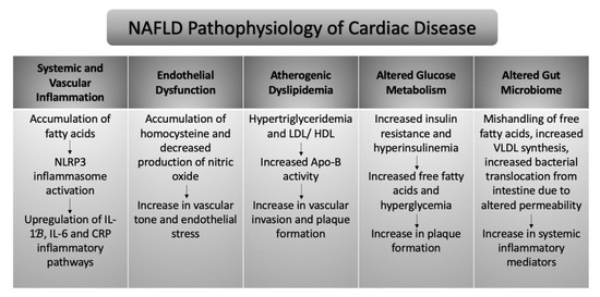It is well established that systemic and vascular inflammation lead to increased plaque and clot formation and act as a main driver for the development of cardiac disease. The milieu of systemic inflammation brought on by NAFLD is a combination of a failure of the liver to properly metabolize certain vaso-altering substances or properly clear inflammatory cytokines from the blood. A principal way this inflammatory state comes about is the accumulation of fatty substances inside the liver parenchyma affecting the proper function of the liver. The inadequate uptake of lipids and altered secretion of certain fatty acids combined with insufficient fatty acid oxidation leads to systemic and vascular inflammation via the pathways described below [63]. Apolipoprotein excess has been linked to increased risk of CVD [64]. The mishandling and subsequent accumulation of apolipoprotein 3 (Apo3) acts as a damage-associated molecular pattern (DAMP) that activates TLRs 2 and 4 by dimerization, thus activating the NLRP3 inflammasome [64]. In its usual role, the NLRP3 inflammasome modulates the activity of caspase-1, an IL-1Beta converting enzyme, activating pro-inflammatory cytokines. In the setting of NAFLD, the increased Apo3 over-activates the NLRP3 inflammasome, increasing flux through the IL-1 to IL-6 to CRP pathway [64]. Other fatty acids, such as palmitic acid, can also activate the NLRP3 inflammasome, representing another distinct pathway for production of inflammatory cytokines [65]. Studies have shown that higher concentrations of palmitic acid are linked to higher rates of cardiovascular mortality, likely due to the increased activity of inflammation through the pathway described above [66]. The mishandling and accumulation of fatty acids in NAFLD lead to higher levels of systemic inflammatory mediators, increasing vascular inflammation and tone, the development of atherosclerotic plaques, and the risk for CVD.