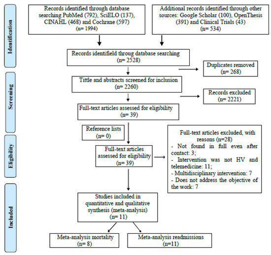 The inclusion criteria were: (i) RCT; (ii) patients diagnosed with HF, both clinically and by complementary exams; (iii) at least two groups: control group (CG) and intervention group (IG); (iv) patients from IG receiving a nursing intervention combining HV and telephone contact; (v) outcome variables of readmission or mortality.