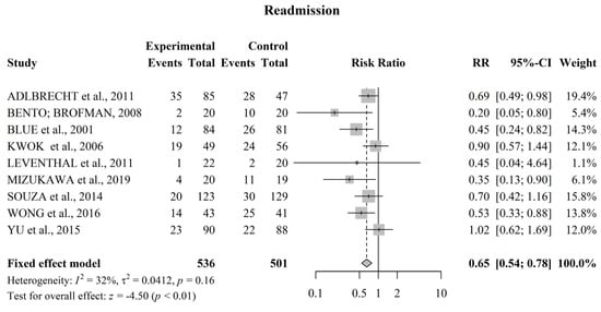 Forest plot of the effect of educational nursing interventions on reducing readmissions in patients with HF. The meta-analysis identified a 36% reduction in the risk of readmission [RR 0.64, 95% CI, 0.54−0.75, p < 0.01]. CI = confidence interval; RR = relative risk. References involved in the study: [12,13,14,15,16,17,20,21,22].