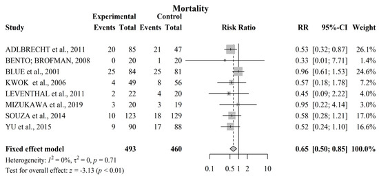 Figure 3 shows a meta-analysis of the effectiveness of nursing interventions on reducing the mortality of patients with HF. In this analysis, eight studies presented mortality data [12,13,14,16,17,20,22]. A total of 953 patients participated in the studies that investigated this outcome. Of these participants, IG shows a lower number of deaths in the follow-up period compared to CG (73 vs. 97, respectively), except in tow studies [14,17] in which an equal value was noted between groups. The risk of bias analysis using the Q test expressed by I2 indicates that the studies were homogeneous (0%) with regard to their methodological process. The meta-analysis indicates that patients with nursing follow-up supported by a pre-established educational intervention had a 35% lower risk of death when compared to those treated with routine care [RR 0.65, 95% CI, 0.50–0.85, p < 0.01].
