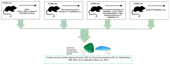 Twenty-four female C57Bl/6 mice were purchased from Envigo Laboratories, Indianapolis, IN, USA. The mice were housed (5 per cage) and maintained on a 12 h light–12 h dark cycle (lights on at 7.00 am) in a temperature-controlled room (22 ± 2 °C) with food and water ad libitum. The experimental protocols, in accordance with the EU Directive 2010/63/EU for animal experiments and Italian D.L.vo 26/2014 law, were approved by the Ministry of Health with authorization number 1467/17-PR of 13-02-2017, and institutional ethics committees: Organismo preposto al benessere degli animali (OPBA). The mice were randomized for weight in treatment groups (n = 6) considering an average of 20.5 g per group (Figure 1): Sham/control (n = 6): 10 days i.p. saline (100 μL of water for injectable solutions), Doxorubicin (DOXO) (n = 6): 3 days i.p. saline, then 7 days i.p. DOXO at 2.17 mg/kg/day, Singo (n = 6): 10 days of oral Singo (combination of Spirulina, Reishi and Moringa) at 12 mg/kg); Singo + DOXO (Singo–DOXO) (n = 6): 3 days of oral Singo, then 7 days of oral Singo + i.p. DOXO (Figure 1). The cardioprotective regimen was based on the same preclinical protocol followed by our research group [43].