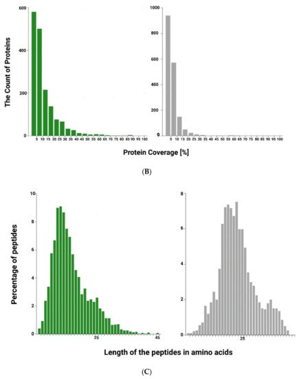(A) Distribution of relative molecular mass for all identified proteins in Arthrospira platensis (green) and in Moringa oleifera (grey) extracts; (B) Distribution of protein sequence coverage for all identified proteins; (C) Distribution of lengths for all identified peptides.