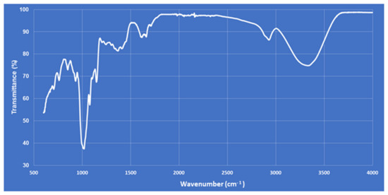 The polysaccharides were isolated from G. lucidum aqueous extract following a protocol previously described by Kan et al. (2015) applying the following experimental conditions: ratio of water to material: 30 mL g−1; extraction time and temperature: 120 min and 60 °C, respectively [42]. After the extraction was completed, cooling, centrifugal separation (6000 rpm, 10 min, 4 °C), and filtering were carried out in sequence to obtain a supernatant fluid containing G. lucidum polysaccharides (GLP). Finally, the GLPs were lyophilized for 24 h (LyoQuest-55, Telstar Technologies, Terrassa, Spain) using the condenser temperature of −52 °C and 0.100 mBar as the vacuum value. Dry GLP extract was analyzed at 4000–600 cm−1 at 25 °C using a Spotlight 400 FT-IR Imaging System (PerkinElmer, Waltham, MA, USA) to determine the organic functional groups of GLPs.