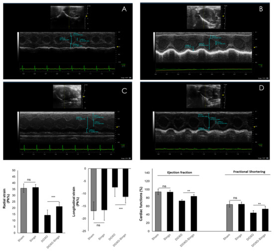 Cardiac function studies in mice untreated (saline) or treated with Singo at 12 mg/kg/day, Doxorubicin (DOXO) at 1.25 mg/kg/day and both in combination for 10 days. Vevo 20,100 model was used as echocardiography for the determination of radial strain, longitudinal strain, ejection fraction and fractional shortening. Up: A characteristic picture of cardiac contractility in mice untreated (A), treated with Singo (B) or DOXO (C) or both in combination (D). Down: Radial strain (Pk %), Longitudinal Strain (Pk %), Ejection Fraction (%) and Fractional Shortering (%) in mice untreated or treated with Singo or DOXO or both in combination. Results: mean +/− SD. ns: not significant; *** p < 0.001. ** p < 0.01.