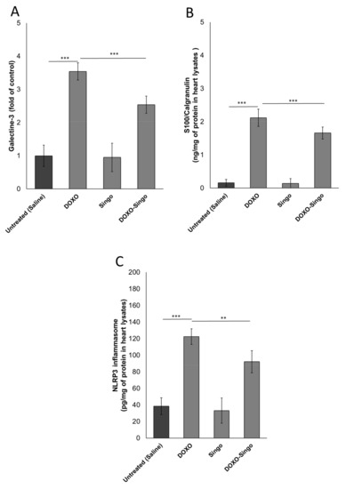 Cardiac DAMPs (Galectin-3 and S-100 calgranulin) (A,B) and NLRP-3 (C) expression in the myocardial tissue of mice untreated (saline) or treated with DOXO, Singo or both in combination for 10 days. Results: mean +/− SD. p-values: *** p < 0.001. ** p < 0.01.