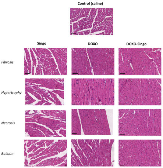 Histological study of cardiac tissues of mice not treated or treated with DOXO, Singo or both in combination. At the end of the experiment, after appropriate sacrifice, the tissues were analyzed for the evaluation of hypertrophy, fibrosis, necrosis and balloon. Scale bar: 50 µm.