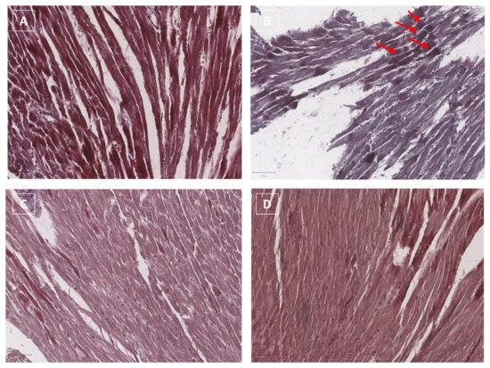 Masson’s Trichrome is a commonly used collagen staining method for cardiovascular fibrosis detection. Masson’s trichrome staining in myocardial tissues (Figure 8) clearly indicates that DOXO increases cardiac fibrosis (see red arrows) compared to untreated mice (Figure 8B vs. Figure 8A, respectively). The staining of the collagen fibers can be highlighted in blue using Masson’s trichrome method; in this case, in Figure 8B, the collagen fibers can be detected in a color close to blue due to the overlap with the red/pink corresponding to the cytoplasm staining of cardiac cells. Collagen fibers in the cardiac tissue of Singo mice are not detectable through Masson’s trichrome staining, (Figure 8C). Moreover, in DOXO–Singo mice, collagen staining in myocardial tissues is almost completely absent, confirming the anti-fibrotic activity of Singo during anthracycline treatment (Figure 8D). Comparing the tissue structure of DOXO (Figure 8B) and DOXO–Singo (Figure 8D), cardiac muscle cells with a more linear and homogeneous parallel band structure can be seen in the DOXO–Singo group compared to the DOXO mice (where the tissue structure is more disorganized, with a non-linear shape of the cardiac muscle cells).