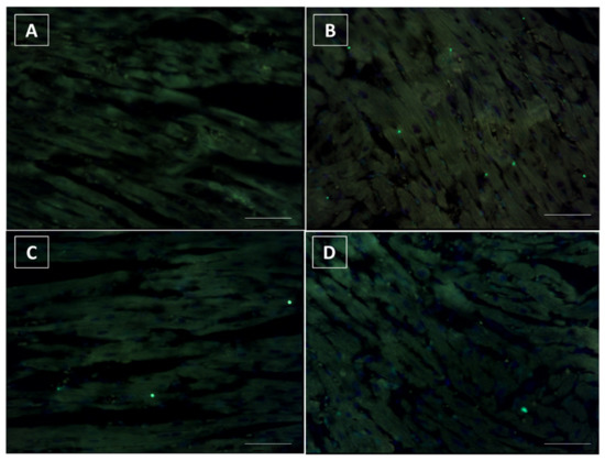 The heart samples were fixed with 10% formaldehyde, paraffin embedded and cut into 4 μm-thick sections. A DeadEnd™ Fluorometric TUNEL System was used to assess apoptosis in the mouse heart samples. A TUNEL panel was performed for the fluorescence staining of the fragmented DNA in the apoptotic cells. Images were recorded digitally using an LMD camera (Leica) fitted with 20× and 40× objectives, and the samples were analyzed by counting the positively stained nuclei.