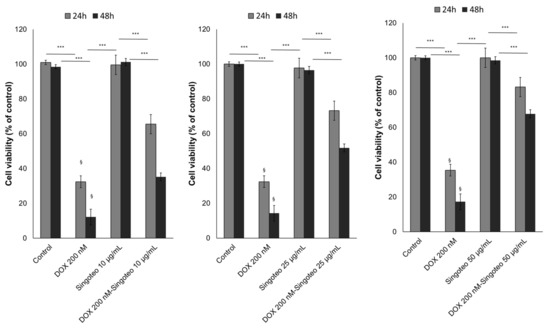 Cell viability of human cardiomyocytes exposed to DOXO at 200 nM, Singo at 10, 25 and 50 µg/mL, or both in combination for 24 and 48 h. Results: mean +/− SD. *** p < 0.001. §: p < 0.001 between the DOXO 200 nM group and DOXO 200 nM associated with Singo 10 µg/mL.