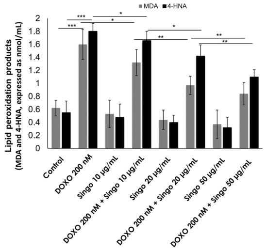 Lipid peroxidation products (MDA and 4HNA) expressed as nmol/mL were quantified in human cardiac cells unexposed (control) or exposed to DOXO (200 nM), Singo (10, 25 and 50 µg/mL) or both in combination for 24 h. Results: mean +/− SD. *** p < 0.001. ** p < 0.01. * p < 0.05.