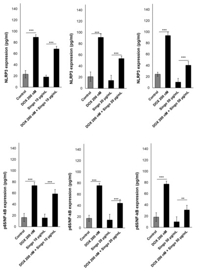 NLRP-3 inflammasome (upper panels) or p65/NF-kB (lower panels) expressed as pg/mL were quantified in human cardiac cells unexposed (control) or exposed to DOXO (200 nM), Singo (10, 25 and 50 µg/mL) or both in combination for 24 h. Results: mean +/− SD. *** p < 0.001. ** p < 0.01.