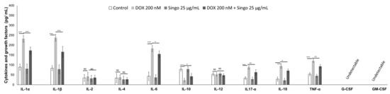 Cytokines and growth factors (IL-1α, IL-1β, IL-2, IL-4, IL-6, IL-10, IL-12, IL-17α, IL-18, IFN-γ, TNF-α, G-CSF and GM-CSF) involved in cardiotoxicity and inflammation expressed as pg/mL were quantified in human cardiac cells unexposed (control) or exposed to DOXO (200 nM) or Singo (25 µg/mL) or both in combination for 24 h. Results: mean +/− SD. ns: not significant. *** p < 0.001. ** p < 0.01. * p < 0.05.