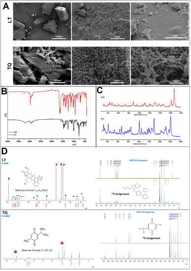 The morphological topographies of TQ and LT samples were analyzed using a field emission scanning electron microscope (FESEM) (Thermo Scientific Quattro, Waltham, MA, USA). Devices that performed scanning electron microscopy imaging in high-vacuum mode were also utilized. In addition, the structural analysis was evaluated using an ATR-FT-IR spectrometer (a Shimadzu IR–Tracer 100 Fourier Transform Infrared Spectrophotom from Tokyo, Japan), and the Raman spectra of the samples were measured using a Raman spectrometer (HOUND UNCHAINED LABS spectrometer, California, USA). The 1H NMR spectra, the 13C NMR spectra, and the 13C DEPT spectra were all acquired using a JEOL spectrometer with a frequency of 600 MHz (JEOL RESONANCE Inc., Tokyo, Japan).
