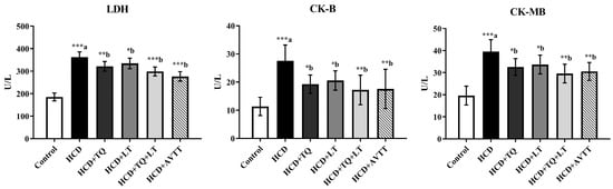 Effect of thymoquinone (TQ), losartan (LT) and their combination on high-cholesterol diet (HCD)-induced changes in serum lactate dehydrogenase (LDH), creatine kinase-B (CK-B) and creatine kinase-MB (CK-MB) levels. Data are expressed as Mean ± SE (n = 6) and analyzed using one-way ANOVA followed by Student–Newman–Keuls as post hoc test. a Control vs. HCD group; b HCD vs. QT or LT or QT + LT. p values considered significant when * p < 0.05, ** p < 0.01 and *** p < 0.001.