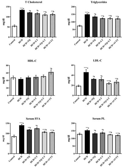 In Figure 3, the blood concentrations of TC, TG, LDL-C and FFA in rats with hypercholesterolemia are shown to be considerably (p < 0.001) higher than in normal rats. TQ and LT alone reduced TC serum concentrations in the HCD-fed rat groups at p < 0.01 and p < 0.05 compared to the untreated HCD-fed rat groups. Combining TQ and LT inhibited TC levels in the blood more effectively (p < 0.001) than in the untreated HCD-fed rat groups, and this impact was almost identical to that of atorvastatin, the standard cholesterol-lowering medication. Serum TG levels decreased considerably when rats with hypercholesterolemia were treated with either TQ or LT alone (p < 0.05). As a result of the combination of TQ and LT, TG levels in the serum were substantially lower than when they were given separately (p < 0.001). The serum TG levels of rats given AVTT were considerably lower than those of rats fed an HCD (p < 0.001). The FFA levels of rats given HCD were considerably (p< 0.001) higher than those of rats fed a regular diet. The TQ therapy dramatically reduced blood FFA levels compared to the HCD-fed rat groups (p < 0.01). FFA levels were also reduced (p < 0.05) after treatment with LT. Comparing the TQ and LT groups to the HCD group, blood FFA levels dropped dramatically (p < 0.001), but AVTT produced findings that were similar. Phospholipids (PL) in HCD-fed rat groups were considerably (p < 0.01) higher than in the normal group. However, individual treatments with TQ and LT significantly (p < 0.05) lowered the serum PL levels, whereas the combined (TQ + LT) treated group showed more significant change (p < 0.01) when compared to HCD-fed rat groups. Comparing TQ and LT to the HCD-fed rat groups, serum LDL-C values were considerably lower (p < 0.01 and p < 0.05, respectively). Both TQ and LT showed greater antilipidemic activity than either agent alone, with comparable effects to AVTT. After six weeks of HCD feedings, the serum levels of HDL-C remained almost unchanged throughout the experiments. It was shown that HDL-C levels rose considerably (p < 0.05) after treatment with AVTT, in contrast to the HCD-fed rat groups.
