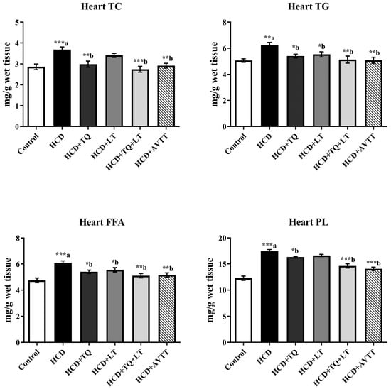The cardiac lipid profile is shown in Figure 4. The total cholesterol (TC) levels of rats given an HCD were considerably (p < 0.001) elevated, whereas those given TQ therapies were significantly (p < 0.01) lower. The combination of TQ and LT considerably (p < 0.001) reduced TC levels in cardiac tissues in hypercholesterolemic rats compared to untreated HCD-fed rat groups. Higher amounts of heart tissue TG were seen in HCD-fed rat groups, compared to normal rats (p < 0.01). TQ and LT treatment lowered cardiac TG levels in comparison to the HCD-fed rat groups (p < 0.05). Nevertheless, cardiac TG levels were higher (p < 0.01) in the TQ and LT group than in the AVTT-treated group (p < 0.01). Significantly high levels of cardiac FFA were seen in HCD-treated rats compared to normal (p < 0.001). TQ and LT therapy significantly reduced myocardial FFA levels in hypercholesterolemic rats (p < 0.05) compared to untreated HCD-fed rat groups. The combination treatment of QT and LT was shown to be more effective against hypercholesterolemia, and its results were found to be comparable to those of the AVTT therapy. Rats with hypercholesterolemia had significantly (p < 0.001) more phospholipids in their heart tissue than rats with normal cholesterol levels. Cardiomyocyte PL levels were significantly reduced after QT therapy in comparison to untreated HCD-fed rat groups (p < 0.05). The combination of TQ and LT reduced myocardial PL levels more significantly (p < 0.001) than the HCD-fed rat groups. HCD-fed rat groups given AVTT had substantially lower myocardial PL levels (p < 0.001) than untreated HCD-fed rat groups.