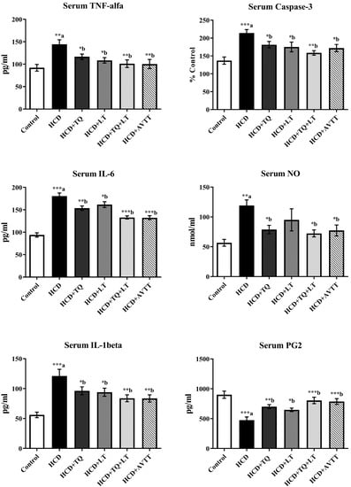 In Figure 5, high-cholesterol-diet-fed animals’ serum caspase-3 levels were considerably (p < 0.001) higher than those of normal groups. It was shown that TQ and LT significantly reduced (p < 0.05) the levels of caspase-3 in the serum of HCD-fed rat groups. Comparatively, serum caspase-3 levels were reduced (p < 0.01) by the combination of TQ and LT compared to the HCD-fed rat groups. Caspase-3 levels in the serum of AVTT-treated rats were equal to those of untreated HCD-fed rat groups (p < 0.05). When compared to normal rats, rats with hypercholesterolemia had considerably (p < 0.01) higher amounts of nitric oxide in their serum. Serum NO levels were significantly lower in the TQ treatment groups compared to the HCD-fed rat groups (p <0.05). As compared to HCD-fed rat groups, TQ and LT dramatically reduced serum NO levels (p < 0.05). Additionally, compared to the HCD-fed rat groups, serum NO levels were lower in those who received AVTT therapy. Serum nitric oxide (NO) levels did not differ substantially between the LT and HCD-fed rat groups. The HCD-fed rat groups showed considerably lower PG2 serum levels than the normal groups (p < 0.001). Hypercholesterolemic rats treated with LT for six weeks had a significant increase in serum PG2 levels (p < 0.05) compared to the HCD-fed rat groups. TQ treatment raised serum PG2 concentrations in HCD-fed rat groups (p < 0.05). On the other hand, rats treated with TQ and LT for six weeks had higher levels of serum PG2 than those in the HCD-fed rat groups. There were significant differences in the HCD groups receiving AVTT therapy, which had raised serum PG2 levels (p < 0.001) compared to HCD-fed rat groups.