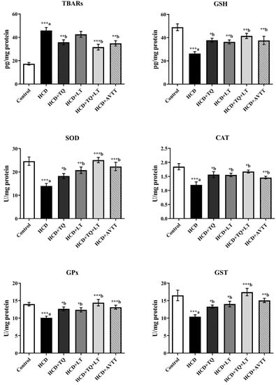 The HCD-fed rat groups had considerably higher (p < 0.001) levels of heart TBARs, but cardiac cell GSH levels were significantly lower (p < 0.001). The TQ therapy significantly reduced the levels of TBARs in HCD-fed rat groups compared to untreated HCD-fed rat groups (p < 0.01). When compared to rats treated with HCD, those given TQ and LT had considerably (p < 0.001) reduced levels of cardiac TBAR. The AVTT therapy significantly reduced (p < 0.01) myocardial TBAR levels as compared to the HCD-fed rat groups. Compared to the HCD-fed rat groups, the TQ and LT groups had substantially higher amounts of GSH in cardiac cells (p < 0.05 and p < 0.01, respectively). GSH levels were increased (p < 0.01) by the combination of TQ and LT. It was shown that AVTT treatment of HCD-fed rat groups significantly increased GSH levels in cardiac cells (p < 0.01) compared to untreated HCD-fed rat groups. Compared to the untreated HCD-fed rats, HCD-treated rats had substantially (p < 0.001) lower levels of SOD and CAT. SOD activity in cardiac cells was considerably increased in the TQ- and LT-treated HCD group compared to the untreated HCD-fed rat groups at p < 0.05 and p < 0.01. When compared to untreated HCD-fed rats, the SOD activity in cardiac tissue was significantly (p < 0.001) enhanced by the combination of TQ and LT. A substantial increase in myocardial SOD activity was also seen after AVTT therapy (p < 0.001). In hypercholesterolemic animals, the QT and LT treatments significantly (p < 0.05) increased CAT activity in cardiac cells. QT and LT therapy, as well as AVTT, increased CAT activity in cardiac cells in contrast to untreated HCD-fed rat groups substantially (p < 0.05 and p < 0.01). In hypercholesterolemic rats, GPx and GST cardiac enzymatic activity was considerably (p < 0.001) lower than in normal groups. The enzymatic activities of GPx and GST in cardiac cells were substantially increased (p < 0.05) in hypercholesterolemic rats treated with QT and LT compared to untreated HCD-fed rats. However, the combination of QT and LT increased GPx and GST activity considerably in cardiac cells (p < 0.001). GPx and GST activities were equally elevated in hypercholesterolemic rats treated with AVTT for six weeks compared to HCD-fed animals not receiving treatment (Figure 6).