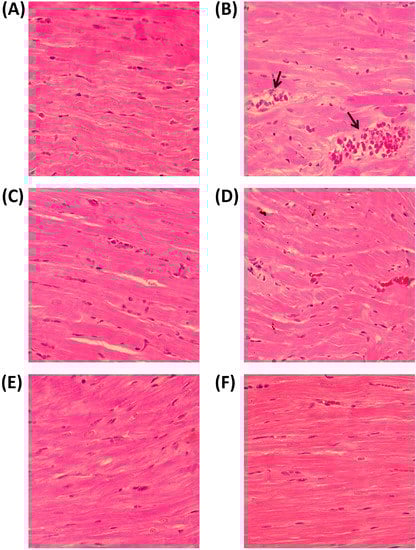 (A) Normal control group sections appeared as normal cardiac muscle tissues. (B) Hypercholesterinemia revealed focal myocardial stiffening and disarranging, vessel congestion and severe intermuscular inflammatory cell filtration as indicated by the arrow. (C) The QT-treated group revealed the appearance of recovered cardiac muscles with mild intermuscular blood congestion. (D) The LT-treated group showed cardiac muscles with mild inflammatory cell filtration and mild bleeding. (E) The QT and LT combined treatment group did not show any significant changes and had almost normal cardiac tissues. (F) AVTT treatment also showed insignificant changes in cardiac tissues, mostly remaining as normal.