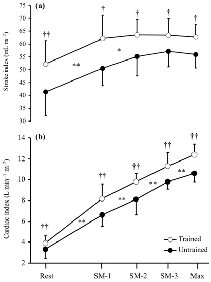 Stroke index (a) and cardiac index (b) at rest and during submaximal and maximal exercise in the child cyclists and untrained children. Difference between workloads for both groups (* p < 0.05 and ** p < 0.001). Difference between the child cyclists and the untrained children († p < 0.01 and †† p < 0.001). Nottin et al., 2002 [34]. Reprinted with permission from Nottin et al. [34], 2002, John Wiley and Sons.