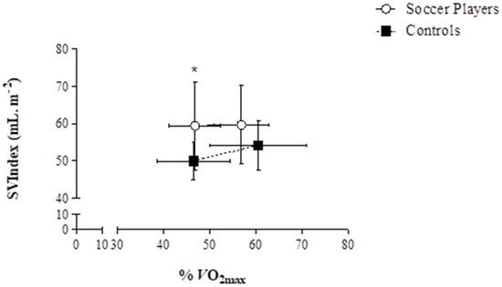 SVIndex responses of soccer players (n = 22) and controls (n = 15) at the two comparable, relative exercise intensities (RE (1) and RE (2)). The symbols denote the mean values. Horizontal error bars denote the variability (SD) in relative exercise intensity (%VO2max) and vertical error bars denote the variability (SD) in SVIndex. At RE (1), the SP demonstrated significantly greater SVIndex responses than the CON. There was no significant inter-group difference in SVIndex at RE (2). * denotes p ≤ 0.05. Unnithan et al. [33]. Reprinted with permission from Unnithan et al. [33], 2018, John Wiley and Sons.