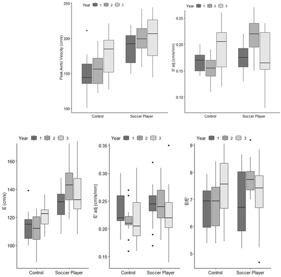 Furthermore, this increase in QIndex was also coupled to superior SVIndex across the three years (Figure 4). It was interesting to note that the magnitude of the SVIndex seen in the adolescent soccer players in the Unnithan et al. [1] study (64 mL/m2) was greater than that seen by Rowland et al. [23] in their cross-sectional study with adolescent soccer players (57 mL/m2). This disparity in SVIndex between the two studies could have been a product of the far greater training load that the adolescent soccer players were exposed to in the Unnithan et al. [1] study compared to the Rowland et al. [23] study and/or the comparisons being made at relative and absolute exercise intensities, respectively. Increases in SVIndex can be driven by an increase in pre-load, decrease in afterload, and/or augmented myocardial contractility. There was evidence to support the contention of preload enhancement through training via the significant increases in E and E′ across the three years after adjusting for growth and maturation (Figure 5), with particularly significant increases in temporally aligned with the significant training volume increases in year two.