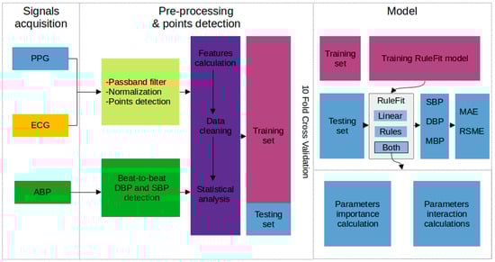 A flow chart of the proposed method is illustrated in Figure 1, including the data acquisition, signal pre-processing, parameter calculation, data cleaning, statistical analysis, and model training and testing steps, as well as calculation of the importance and interactions of features.