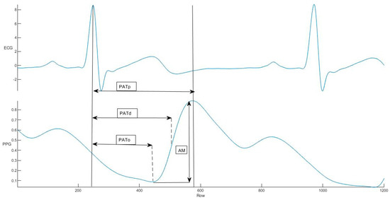 First, each ECG signal was processed with a bandpass filter having a bandwidth of [0.5–30 Hz]. We used the Sabarimalai–Manikandan method for R-peak detection [23]. All recordings were visually examined, and R-peak misdetections were manually corrected. RR intervals were then calculated. R-peak and RR intervals were used to calculate valuable features such as PAT and relative pulse arrival time (RelPAT). Figure 2 illustrates how PAT can be calculated.