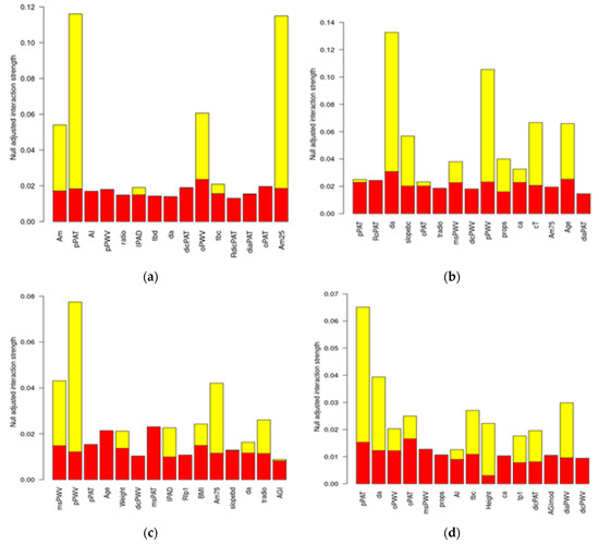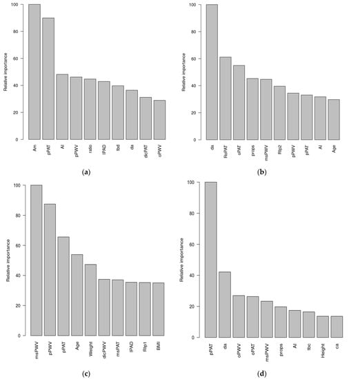 Figure 3 shows the relative importance of the ten most important input predictor variables as averaged over all predictions in descending order of estimated importance. If the DBP is analyzed in a resting state, it is observed that the AM is the most important variable followed by the peak pulse arrival time (pPAT). The SBP shows that, along with demographic variables such as age, weight, and BMI, the parameters derived from PAT and PWV are the most important.