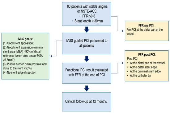 This is a single-center, prospective, observational study, performed at Vilnius University Hospital, Santaros klinikos. Eighty consecutive patients with functionally significant (FFR ≤ 0.8) lesions requiring a stent length of ≥30 mm were enrolled in the study from 1 July 2019 to 31 March 2021. All patients underwent IVUS-guided PCI and the result was assessed with both IVUS and FFR. The study flowchart is shown in Figure 1. This study complies with the Declaration of Helsinki, and the independent regional ethics committee has approved the research protocol (number of approval Nr.2019/6-1150-639). The study was conducted according to good clinical practice recommendations. All patients agreed to participate in this trial and signed an informed consent form. The study is registered on ClinicalTrials.gov (Identifier: NCT05621421).