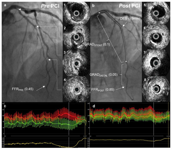 A case example. Pre- and post-percutaneous coronary intervention (PCI) angiographic images with intravascular ultrasound pictures from a corresponding left anterior descending artery segment. Fractional flow reserve curves before and after PCI are presented below. (a) Angiographic image demonstrating diffuse coronary artery disease in the left anterior descending artery (LAD); 1–4—intravascular ultrasound (IVUS) images from corresponding LAD segments showing predominantly soft plaque with mild calcification in mid-LAD (2, 3); (c) distal (Pd, green) and aortic (Pa, red) pressures with fractional flow reserve (FFR) pull-back curve (yellow) demonstrating severe ischemia in the distal LAD; (b) angiographic image after percutaneous coronary intervention (PCI) with an improvement in FFR to 0.85; 5–8—IVUS images from corresponding LAD segments after PCI showing acceptable stent apposition and expansion; (d) post-PCI FFR measurement with a pull-back demonstrating a gradual change in pressure gradient.