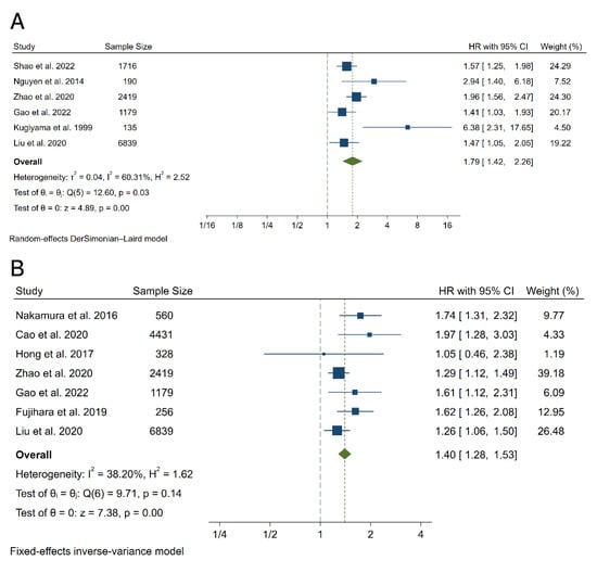 | Shao et al. 2022 [15] | China | Retrospective cohort study | Patients with ACS undergoing PCI | 1716 | 23.3% | 60 ± 10 | RLP-C > 75th vs. RLP-C ≤ 75th | 2.44 ± 0.80 | 30.9 | MACE (354) | Age, sex, BMI, current smoking, hypertension, diabetes, past MI, past PCI, CKD, statins on admission, discharged drugs, complete revascularization, STEMI, hs-CRP, GRACE risk score, left main or multivessel disease. | Selection: 4 Comparability: 2 Outcome: 2 |
