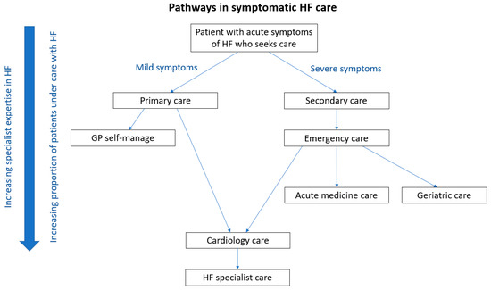 Heart failure (HF) is a global problem responsible for significant morbidity and mortality. It is predicted that with an aging population and improved survival from acute myocardial infarction, patients with HF will continue to increase [1,2]. Being potentially life-changing, HF can cause distressing symptoms and physical disability for the patient, with a significant impact on families. It can be the catalyst for the transition from independent living with no physical restrictions to reduced functional capacity and a need for assistance with daily activities. For some patients, this can translate into depression and poor quality of life [3]. The enormity of the problem has prompted major research on treatments for HF over the last few decades. This has culminated in contemporary management strategies that include medical therapies, device therapy, advanced HF therapies such as transplantation and durable left ventricular assist device therapy, palliative care, general opportunities, as well as the need for monitoring, preventative care, and care coordination, which are supported by both American and European guidelines [4,5]. This arsenal of treatments has transformed the care of patients with HF, and many patients are living longer, with good quality of life. Despite the multitude of therapies available, there are still patients that receive care that does not adhere to guidelines or care that could have been improved. To better understand the care that patients receive, and those who may be overseeing care, it is important to consider the patient pathway from diagnosis to treatment.