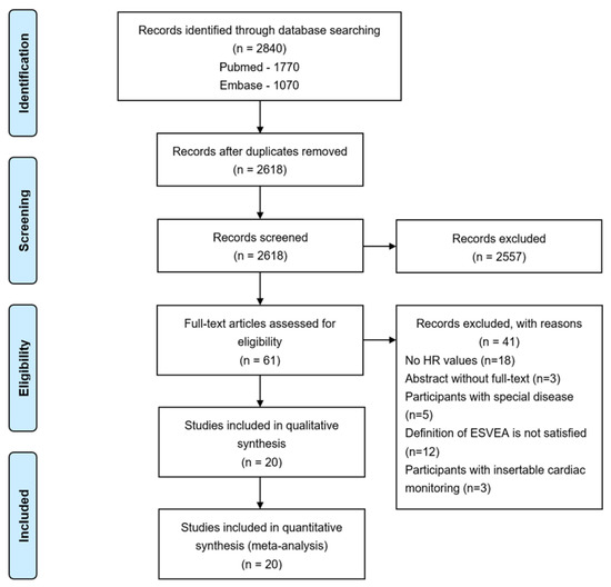In total, 2840 records were retrieved through database searching, of which 222 were duplicates. After screening titles and abstracts, 61 articles were included for full-text review. Finally, 20 studies that satisfied all eligibility criteria were included in the review. A detailed flowchart of the screening process is presented in Figure 1.