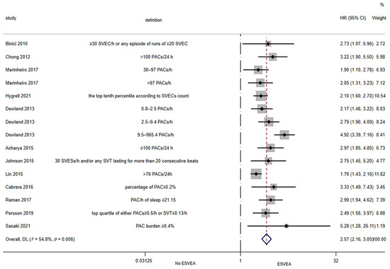 Forest plot of the association between ESVEA and all-cause mortality. Abbreviations: SVEC—supraventricular ectopic complexes; PACs—premature atrial complexes; SVE—supraventricular extrasystoles; ESVEA—excessive supraventricular ectopic activity; HR—hazard ratio; CI—confidence interval. Definition represents the definitions of ESVEA in different studies [12,13,14,22,35,36,39,40,43,45].
