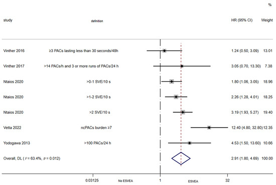 Forest plot of the association between ESVEA and AF in the ischemic stroke patients. Abbreviations: PACs—premature atrial complexes; SVE—supraventricular extrasystoles; ncPACs—non-conducted premature atrial complexes; ESVEA—excessive supraventricular ectopic activity; HR—hazard ratio; CI—confidence interval. Definition represents the definitions of ESVEA in different studies [22,33,36,39,41].