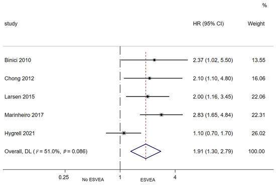 Five studies assessed the association between ESVEA and the risk of new-onset ischemic stroke [12,13,23,35,45]. The random-effects pooled adjusted HR was 1.91 (95% CI 1.30–2.79; I2 = 51%, p = 0.086), indicating that ESVEA increased the risk of new-onset ischemic stroke (Figure 4).