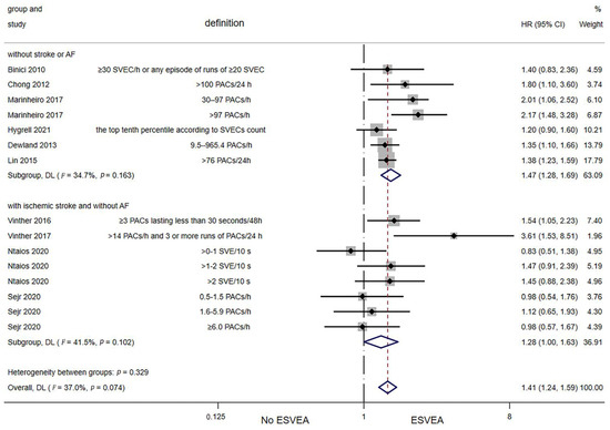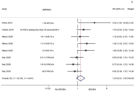 Forest plot of ESVEA and the risk of recurrent ischemic stroke/transient ischemic attack. Abbreviations: APCs—atrial premature complexes; PACs—premature atrial complexes; SVE—supraventricular extrasystoles; ESVEA—excessive supraventricular ectopic activity; HR—hazard ratio; CI—confidence interval. Definition represents the definitions of ESVEA in different studies [22,39,40,42].