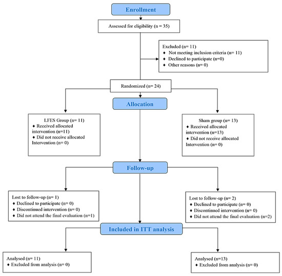 Thirty-five subjects were screened for the study. Eleven participants did not meet the inclusion criteria and were not included. Therefore, twenty-four participants (LFES, n = 11; sham, n = 13) were randomized. Of twenty-four participants, three (LFES, n = 1; sham, n = 2) were lost during the follow-up period due to hospitalization. (Figure 1). No cases of skin burn, or injury caused by FES, occurred.