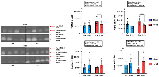 Regarding Pro-MMP-9 activity, LFES showed lower values at post-training compared to pre-training (0.083 to 0.062, p = 0.002) (Figure 2A). Similarly, Active-MMP9 activity decreased in the LFES group after intervention (0.135 to 0.093, p = 0.02) (Figure 2B). There were no significant changes between groups and time points for Pro-MMP2 activity (p > 0.05; Figure 2C). However, we observed an increase of Active-MMP2 activity in the LFES group at post-training compared to pre-training (0.057 to 0.163, p = 0.0001) (Figure 2D).