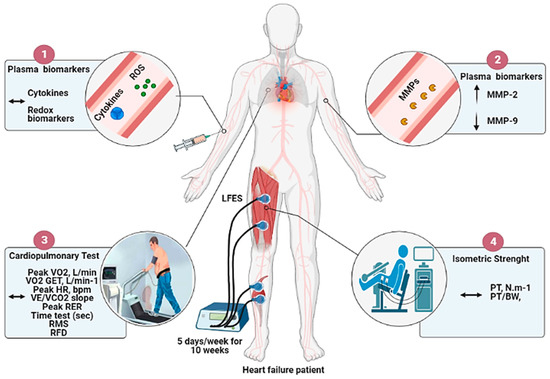 Currently, serum molecular changes in HF patients contribute to peripheral vascular endothelial function and muscle remodeling after LFES has not been determined. The effects of LFES on redox biomarkers, cytokines, and MMPs in the blood circulation may contribute to new insights into training adaptations. This information would be valuable to elucidate possible protective mechanisms that are regulated by controlled intervention. Non-invasive biomarkers might undoubtedly improve our understanding of disease progression from a chronic perspective. Furthermore, no study has addressed the influence of LFES on maximum voluntary isometric contraction in HF patients. Therefore, this study aimed to investigate the effect of 10 week-LFES on plasma cytokines profile, redox biomarkers, MMP-2-9 activity, and exercise performance in HF patients. We hypothesized that LFES improves cardiorespiratory fitness and muscle strength and inhibits inflammatory activity, besides restores MMPs activity and general redox status, thus reducing plasma oxidative stress markers.