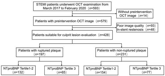 From March 2017 to February 2020, 593 ST-Segment Elevated Myocardial Infarction (STEMI) patients with OCT examination were enrolled in our cohort study. A STEMI was defined as continuous chest pain lasting >30 min, ST-segment–elevation >0.1 mV in at least two contiguous leads, or a new left bundle-branch block on the 18-lead ECG, and an elevated troponin I level [9]. We excluded patients with cardiac shock, congestive heart failure, history of coronary artery bypass graft and those with left main diseases, extremely tortuous or heavily calcified vessels, or chronic total occlusion as for our previous study [10]. The study flow chart is displayed in Figure 1.