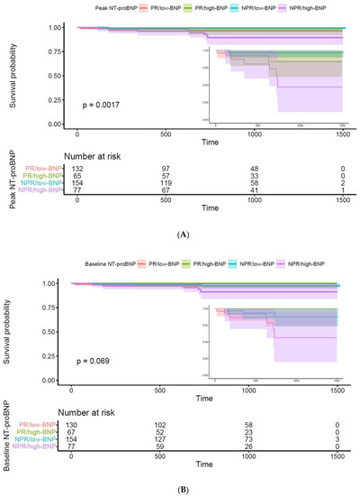 Continuous variables are reported as mean ± standard deviation or median (interquartile range) and categorical variables are presented as numbers (percentages). One-way analysis of variance or Kruskal–Wallis tests were used for comparison of continuous variables. Categorical variables were compared using Pearson chi-square tests or Fisher’s exact test when appropriate. Patients were trisected based on level of baseline and peak value of NT-proBNP in whole population and subgroup of PR and NPR. Tertile 1–2 and Tertile 3 were identified as the low and high NT-proBNP group, respectively. Survival curves were constructed and compared using the Kaplan–Meier method and Log rank test. Univariate and multivariable Cox proportional hazards regression model was used to assess the all-cause death, recurrence of myocardial infarction, stroke, and MACEs composite risk of the four groups, and hazard ratio (HR) and 95% confidence interval (CI) were showed. Subgroup analysis was performed to assess the effect of peak value of NT-proBNP on cardiovascular risk in patients present with different plaque types. Receiver operating characteristic curve (ROC) and area under curve (AUC) were used to evaluate the predictive ability of traditional risk factors and addition of peak value of NT-proBNP combined with plaque types (PR&NPR) for death. Time-dependent receiver operating characteristic (ROC) curves were used to show the predictive power of traditional risk factors and the new model combining traditional risk factors, peak value of NT-proBNP, and plaque types by the method of nearest neighbor estimation. Using net reclassification improvement (NRI) and integrated discrimination improvement (IDI), we also calculated the ability of the new model to reclassify the risk of death in contrast to traditional risk factors. Analyses were conducted using IBM SPSS Statistics version 26.0 (IBM SPSS Statistics, IBM Corporation, Armonk, New York, USA) and R (http://www.r-project.org/, accessed on 10 March 2022) statistical packages. Statistical significance was set at p-value of <0.05.
