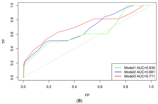 The ROC curves were plotted to evaluate the diagnostic value of traditional risk factors and in combination with the peak value of NT-proBNP and plaque types (Figure 3A). The AUC of Model 1 containing risk factors (including age, gender, hypertension, hyperlipidemia, diabetes, smoke, LDL, Hs-CRP, LVEF) was 0.780 (95% CI: 0.738–0.819). Model 2 was established by adding the peak value of NT-proBNP and its AUC was 0.793 (95% CI: 0.751–0.830). While adding plaque types to Model 2, the AUC of Model 3 increased to 0.843 (95% CI: 0.805–0.876). The addition of the peak value of NT-proBNP and plaque types to the traditional risk factors model also resulted in a significant increase in the NRI (26.8% [95% CI: 0.4–53.1%], p = 0.046) and IDI (5.1% [95% CI: 1.0–9.2%], p = 0.016) (Supplemental Table S2). Furthermore, time-dependent ROC curves of traditional risk factors and addition of the peak value of NT-proBNP and plaque types for 3-year death occurrences are shown in Figure 3B. Traditional risk factors plus the peak value of NT-proBNP and plaque types presented higher AUC to predict death than the other two models (AUC of Model1 vs. Model2 vs. Model3 = 0.630 vs. 0.681 vs. 0.711) but showed no significant difference between every combination of two models (p Model1 vs. Model2 = 0.555, p Model2 vs. Model3 = 0.387, p Model1 vs. Model3 = 0.398).