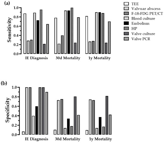 Eight qualitative parameters were analyzed, and three of them (HP, valve culture, valve PCR) were collected perioperatively (Table 2). The highest sensitivity for the diagnosis of IE had TEE, blood cultures and HP. The highest specificity had F-18-FDG PET/CT, the detection of a valvular abscess (via TEE or computed tomography), HP and valve culture (Figure 1). The highest sensitivity for the outcome 30-day mortality and 1-year mortality had blood cultures, detection of systemic embolism, HP, valve PCR and TEE, whereas valve culture, F-18-FDG PET/CT, and the absence of valvular abscess bore the highest specificity. Despite its intermediate sensitivity, valve PCR was beneficial for detecting germs like Cutibacterium acnes and Granulicatella sp. in blood culture-negative patients.