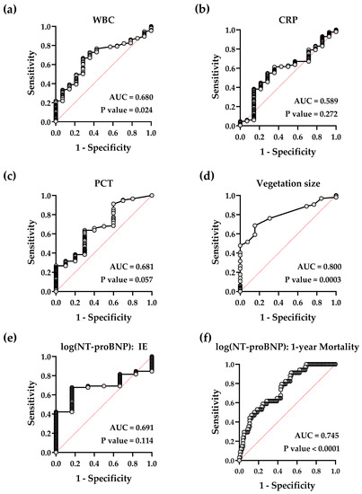 Simple logistic regression of quantitative diagnostic tools. Receiver-operating characteristic curves showing the predictive power for diagnosis of either IE (a–e) of white blood cell count (WBC), C-reactive protein (CRP), procalcitonin (PCT), vegetation size and N-terminal prohormone of B-type natriuretic peptide (NT-proBNP) or 1-year mortality of NT-proBNP (f).